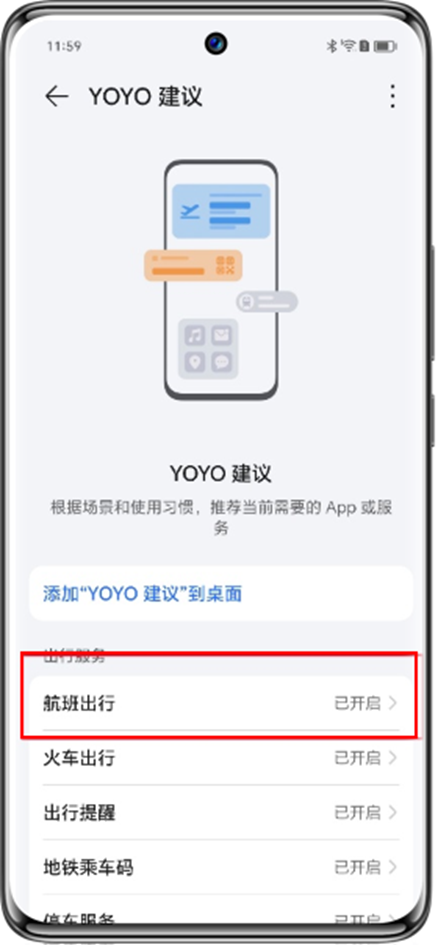 请点击设置>荣耀AI & YOYO/智慧助手>YOYO建议>航班出行开关,按照操作绑定“航旅纵横”即可,操作步骤截图如下: