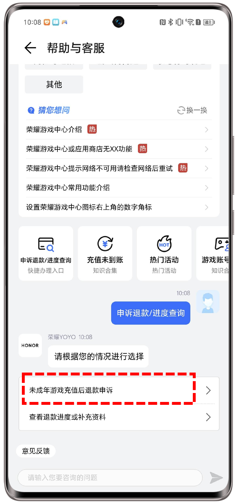- 您也可以使用被消费荣耀账号登录荣耀游戏中心>我的>帮助与客服,点击申诉退款/进度查询,然后选择未成年游戏充值后退款申诉