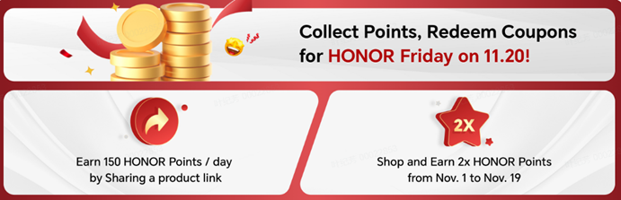 | 5.3 | نقاط HONOR - نقاط HONOR x2 عند الطلب | من 1 نوفمبر إلى 19 نوفمبر |