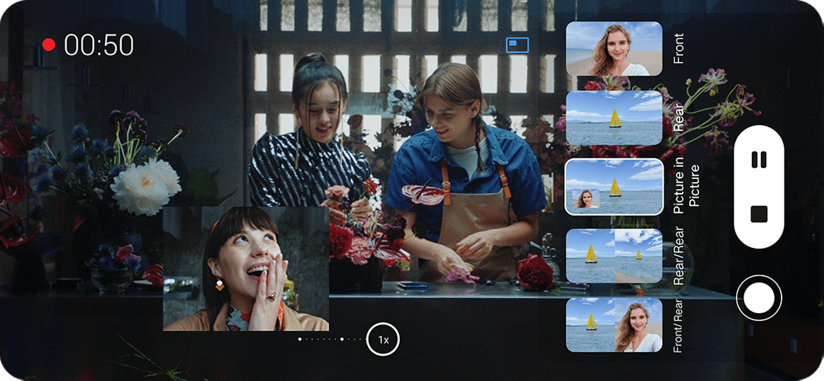 عند تصوير الفيديو بعدسات متعددة، يمكن استخدام الكاميرا الأمامية والخلفية في نفس الوقت،