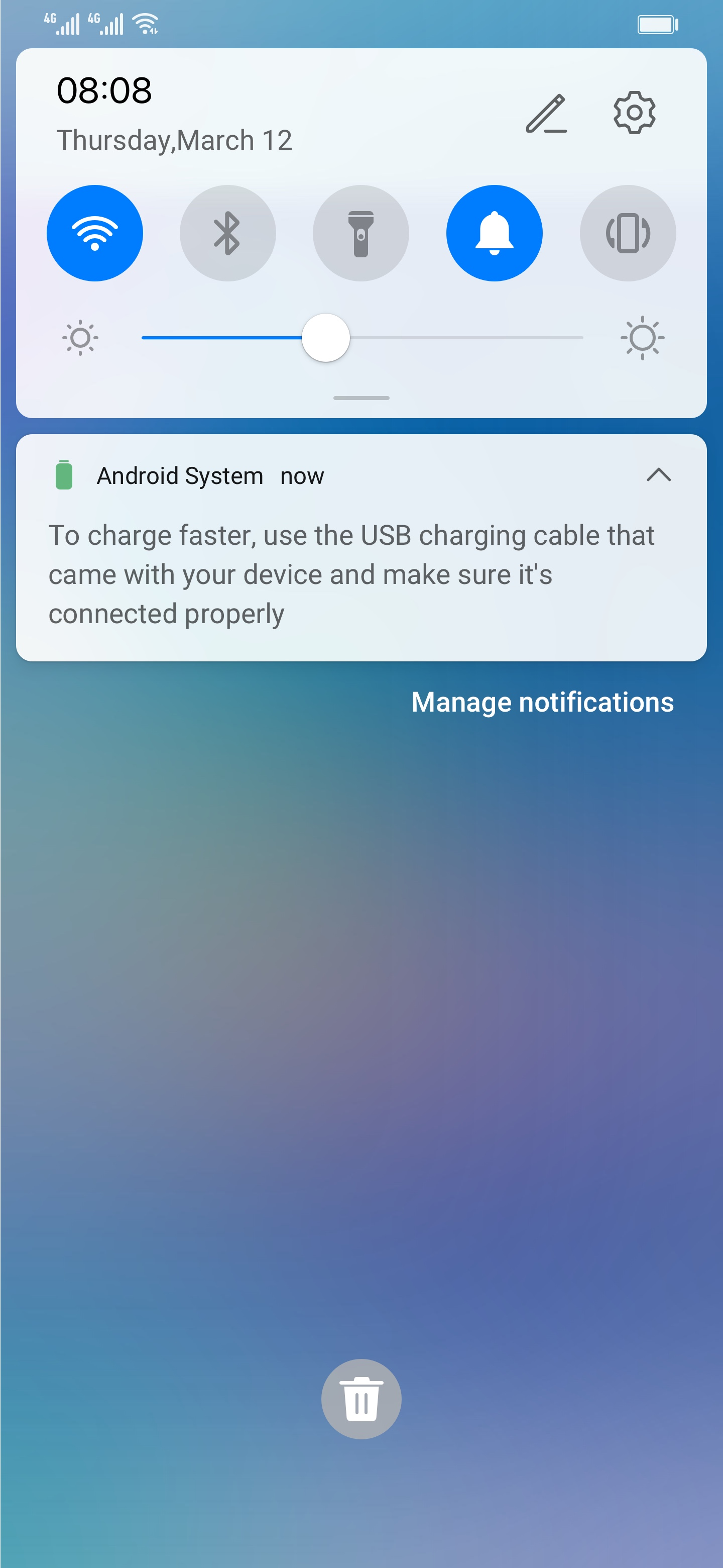 بعد تحديث الهاتف إلى نظام EMUI 10.0.1 أو 10.1، يتم عرض "للشحن السريع، يُرجى استخدام كابل شحن USB المرفق مع جهازك والتأكد من توصيله بشكلٍ صحيح." في لوحة الإشعارات عندما يقوم المستخدم بشحن الهاتف، كما هو موضح في الشكل التالي.