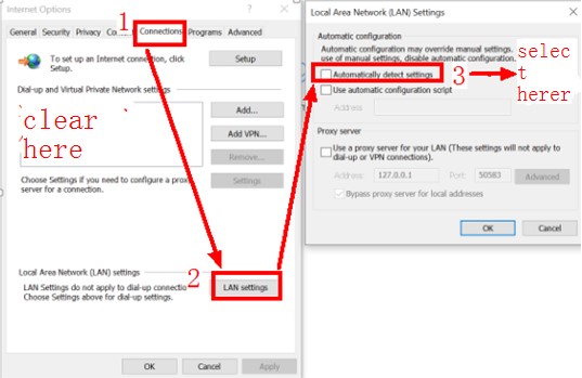 Right-click the Windows icon, go to System > Network & Internet, disable Use setup script, and enable Use a proxy server.