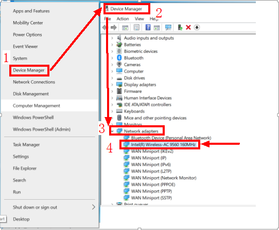 Open Device Manager, find Network adapters, right-click Intel(R) Wireless-AC 9560 160 MHz, click Uninstall, and restart your computer.