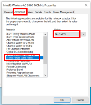 Click Advanced, click MIMO Power Save Mode, select No SMPS under Value, then click OK.