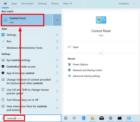Enter Control Panel in the search box on the taskbar and open Control Panel.