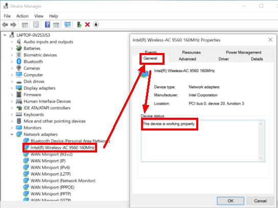 On your computer, go to Device Manager > Network adapters, double-click Intel(R) Wireless-AC 9560 160MHz, click General, and check whether This device is working properly is displayed under Device status.