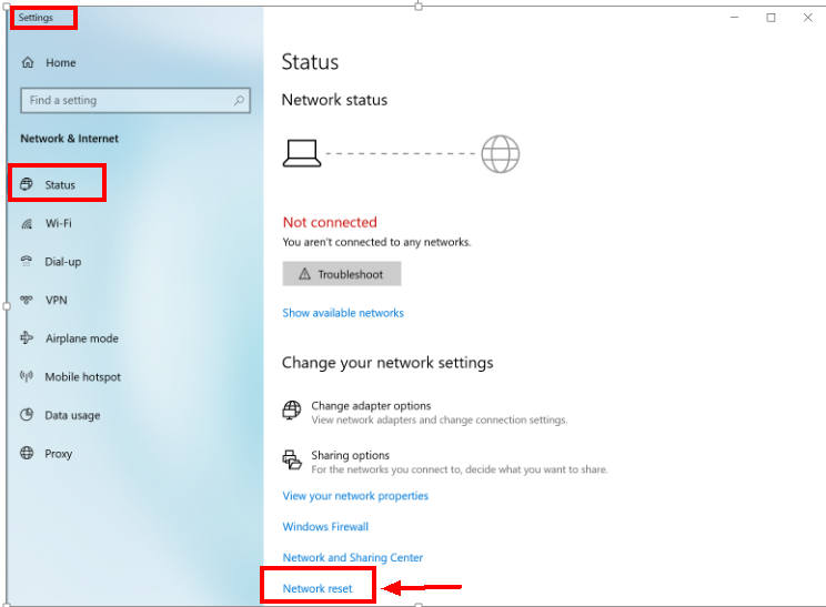To reset the network, click the Windows icon, click the Settings icon, go to Network & Internet > Status, and select Network reset.