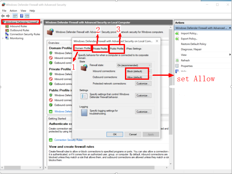 Open Control Panel, go to System and Security > Windows Defender Firewall > Windows Defender Firewall with Advanced Security on Local Computer > Properties and set Firewall state under Domain Profile, Private Profile and Public Profile to Off.