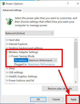 Click + next to Wireless Adapter Settings and set On battery and Plugged in under Power Saving Mode to Maximum Performance.