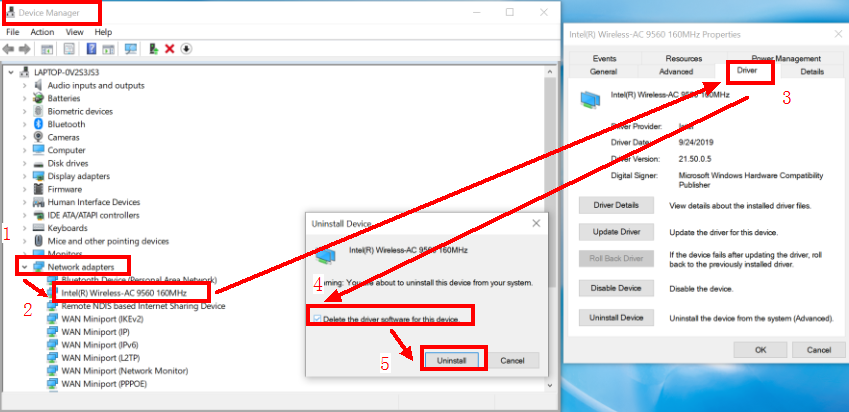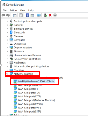 Open Device Manager, find Network adapters, right-click Intel(R) Wireless-AC 9560 160 MHz, click Uninstall, and restart your computer.