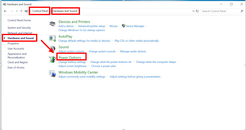 Open Control Panel and go to Hardware and Sound > Power Options.