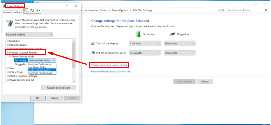 Expand Wireless Adapter Settings, expand Power Saving Mode, and set On battery and Plugged in to Maximum Performance.