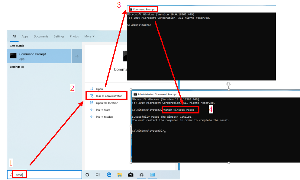 (2) Run cmd.exe as an administrator and run the netsh winsock reset command. Then restart your computer.