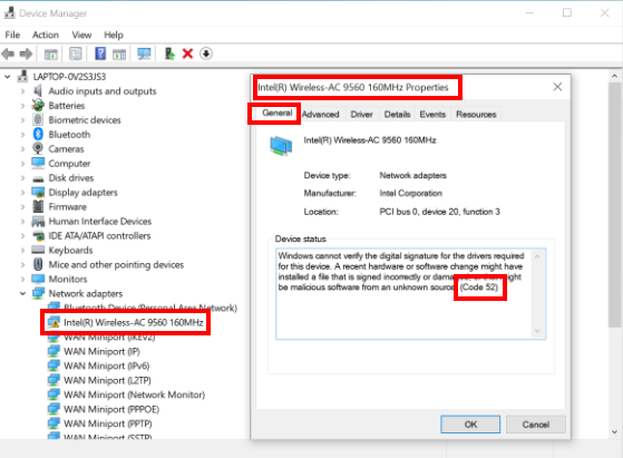 On your computer, go to Device Manager > Network adapters, double-click Intel(R) Wireless-AC 9560 160MHz, click General, and check whether This device is working properly is displayed under Device status.
