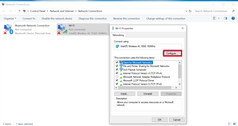Right-click Wi-Fi, click Properties, and click Configure....