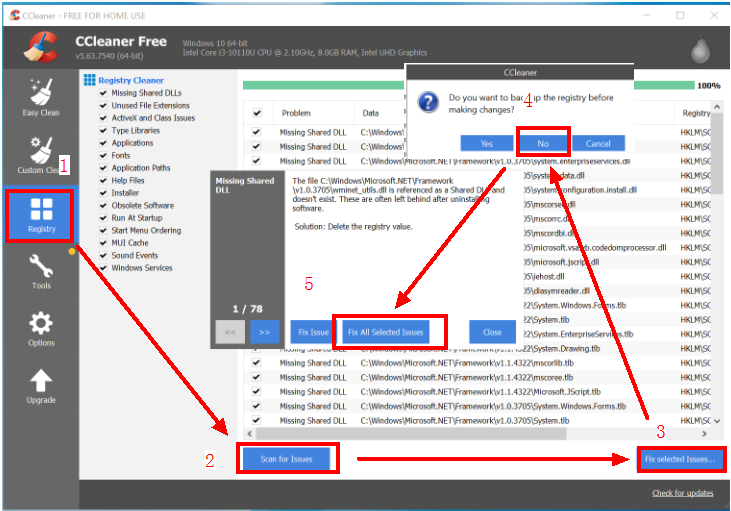 To resolve this issue, download CCleaner. You can also use antivirus software to clear the registry list and check whether this resolves the issue. If this issue persists, uninstall CCleaner and download it again. Visit the official website of CCleaner (https://www.ccleaner.com/ccleaner) and download CCleaner. Then open CCleaner, go to Registry > Scan for issues > Fix selected Issues... > No > Fix All Selected Issues, and restart your computer.