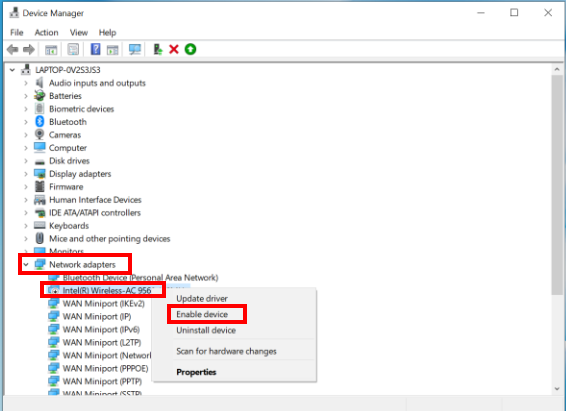 Restart your computer, right-click the Windows icon, go to Device Manager > Network adapters, right-click Intel(R) Wireless-AC 9560 and then select Disable device. Then right-click Intel(R) Wireless-AC 9560 again and select Enable device.