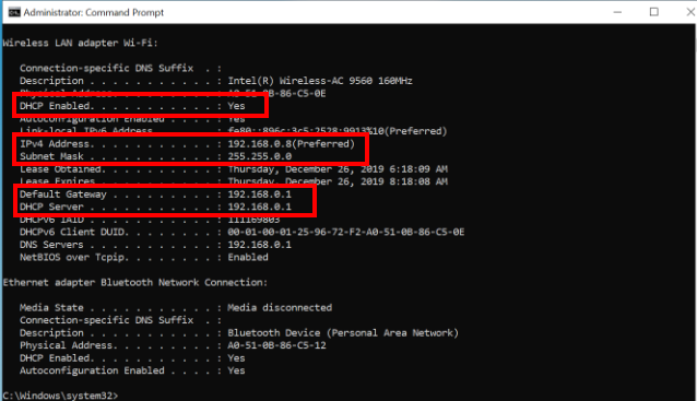 Run the cmd.exe as an administrator and run the ipconfig /all command to view information about the current network adapter.