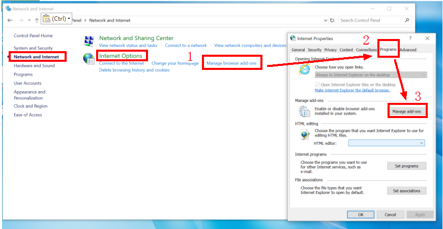 Go to Manage browser add-ons > Programs > Manage add-ons, click Toolbars and Extensions, and check whether there are any abnormal add-ons.