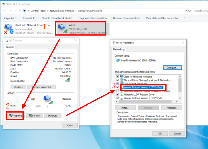 Click the Wi-Fi icon and then go to Network & Internet settings > Network and Sharing Center > Change adapter settings. Right-click Wi-Fi, select Properties, click Internet Protocol Version 4 (TCP/IPv4), and select Obtain an IP address automatically and Obtain DNS server address automatically.