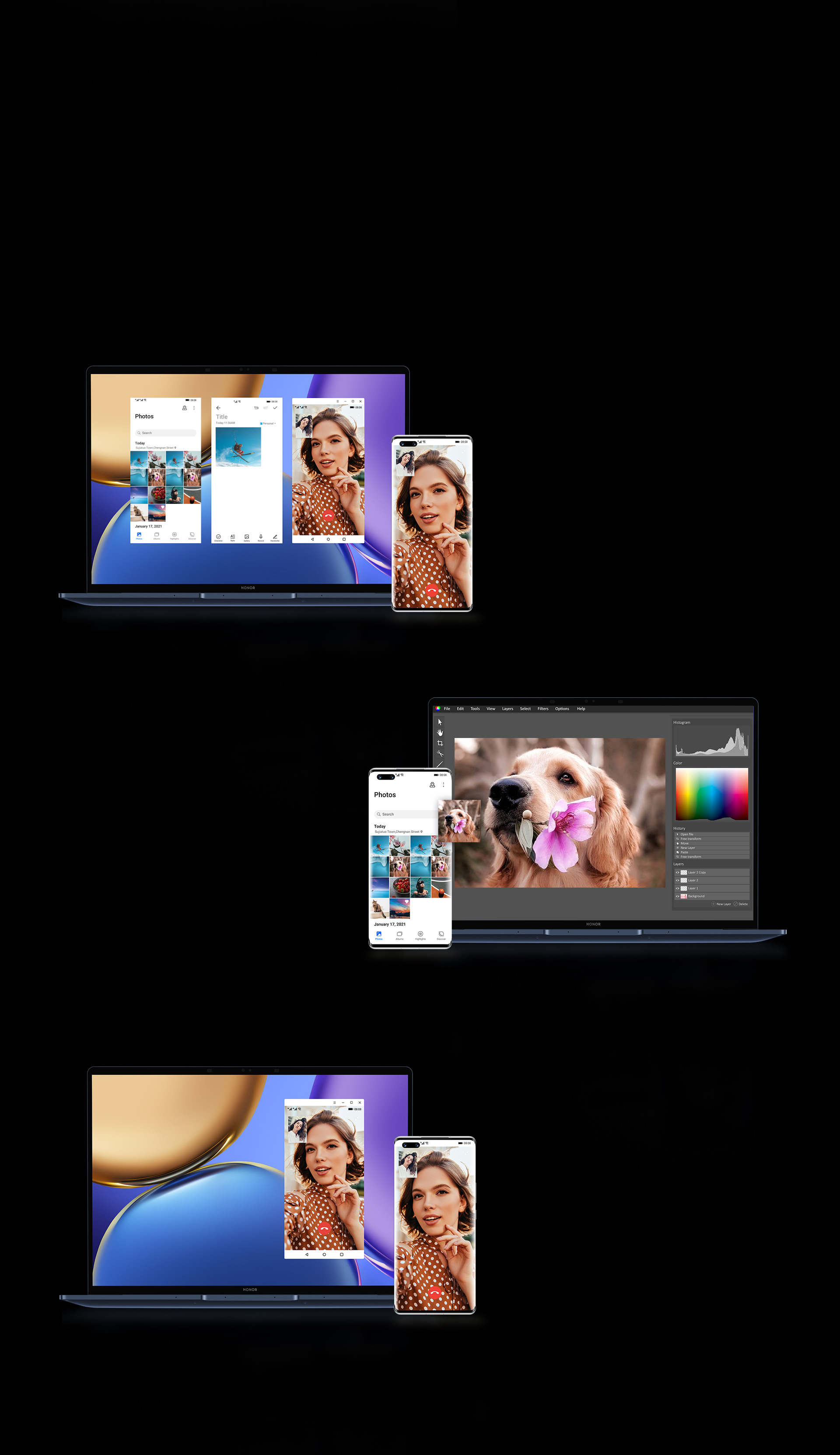 6. Данная функция поддерживается только на ноутбуках HONOR MagicBook (определенных ноутбуках с версией PC Manager 11.0 или выше) и определенных смартфонах с Magic UI 4.0 и выше. Данная функция совместима только с определенными видами файлов и мобильными приложениями. Функция поддерживает работу одновременно до 3 приложений и основного интерфейса смартфона на экране ноутбука HONOR. Более подробную информацию можно получить на официальном сайте HONOR.