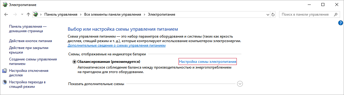 3. Нажмите Настройка схемы электропитания напротив опции Сбалансированная (рекомендуется).