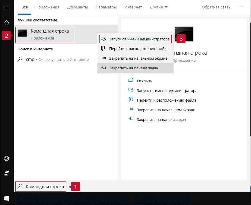 2. В строке поиска введите «cmd», правой кнопкой мыши нажмите Командная строка и выберите Запуск от имени администратора.