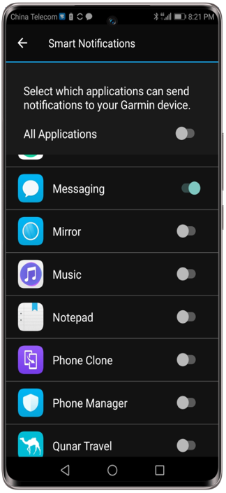 - Abra la aplicación Garmin Connect, presione el menú ubicado en el extremo superior izquierdo, y acceda a Configuración > Notificaciones inteligentes para permitir que aplicaciones específicas envíen notificaciones a su reloj Garmin.