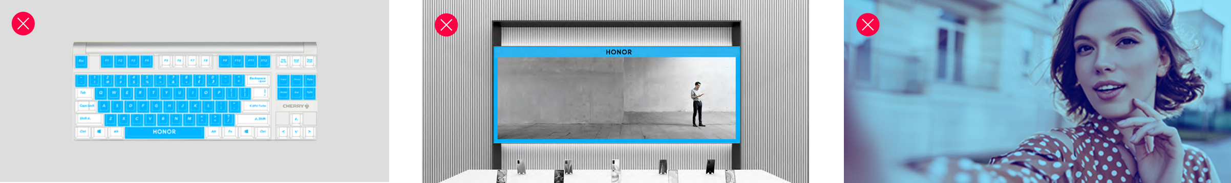 荣耀品牌主色为单色黑、单色白。同时为使品牌形象统一而富有变化,适应不同场景的需要,特选定“蓝色”作为点缀,配合品牌主色使用。运用专色数据、四色数据、RGB数据时,必须依照标准色彩规范呈现。在任何情况下,均不能更改有关颜色及比例。