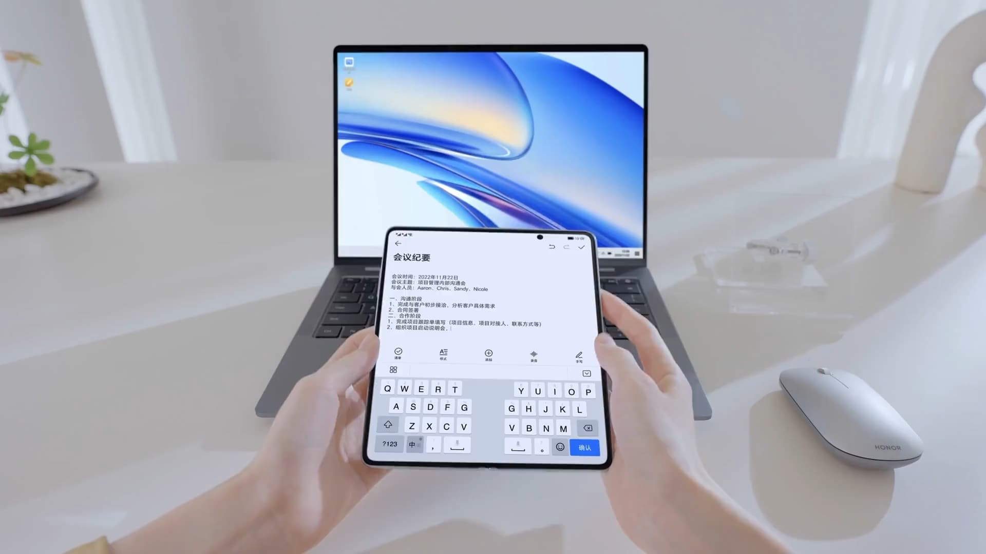 三指上滑,进入控制中心,拖动图标触碰周围的荣耀设备,一步开展多设备协同;
