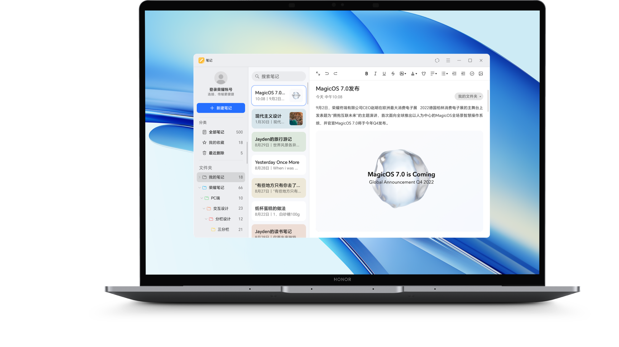 首发电脑版荣耀笔记,帮你更高效的笔记整理,更快速的笔记编辑。在荣耀手机、平板、电脑设备上,随时随处查看修改笔记2。