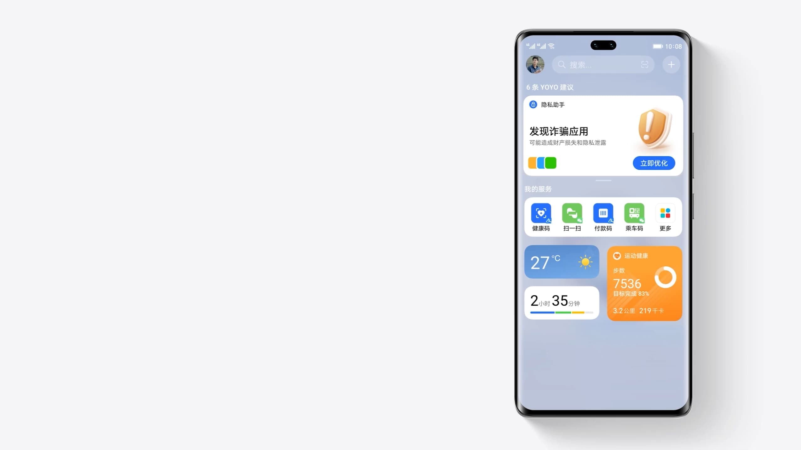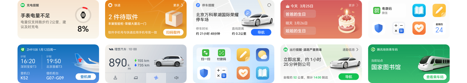 地铁通勤、无忧打卡、健康码、付款码、惬意观影、快递提醒、充电提醒等多个场景。