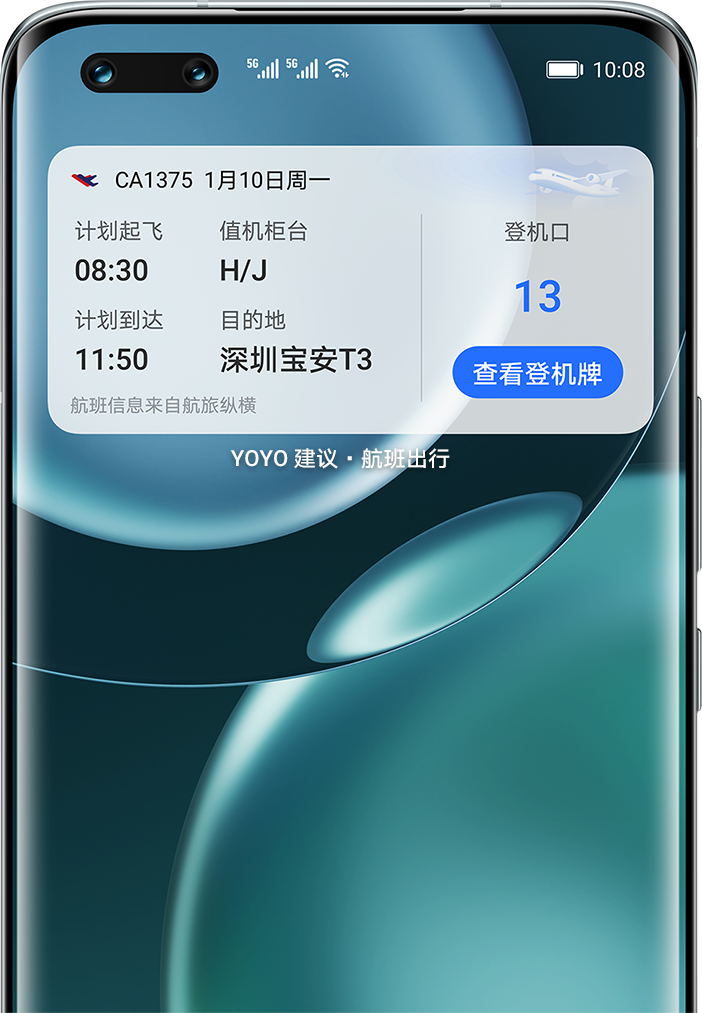 总是切换应用反复查询出行信息?凭借Magic Live智慧引擎驱动,YOYO建议可精准感知你的航旅习惯和周围环境,适时将航班出票、值机、登机等信息,以恰当的方式提醒你,让你轻松出行。