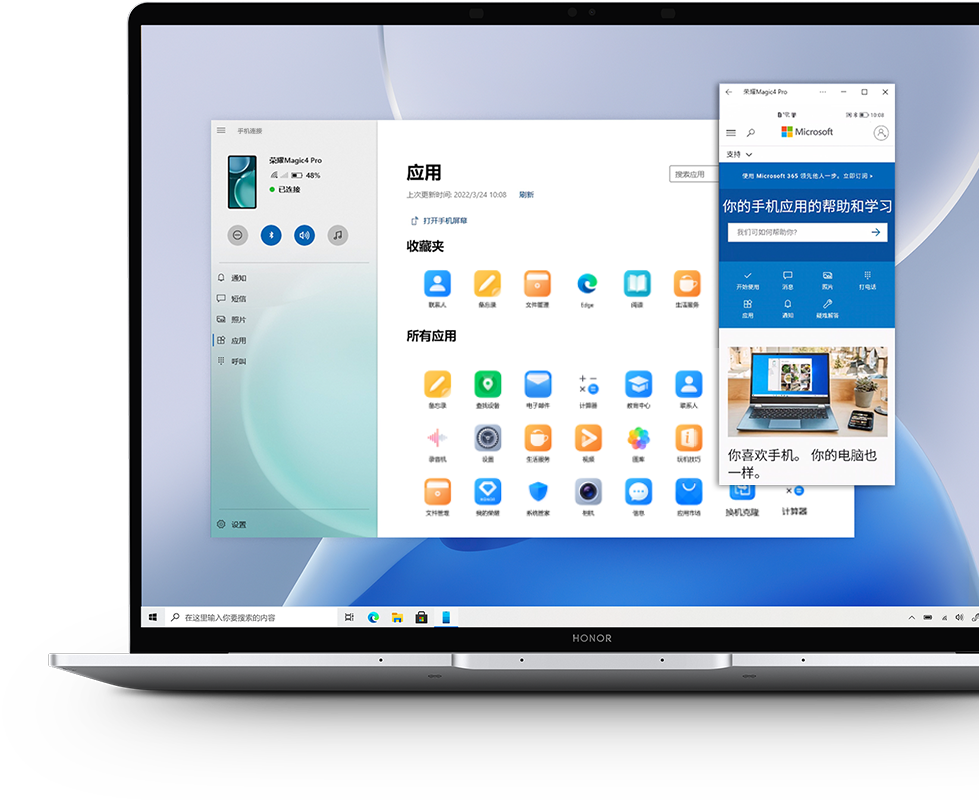 作为微软“手机连接”中国战略合作伙伴,你的荣耀手机可与你的电脑轻松连接,进行消息发送、图片同步,还可以直接打开手机上的APP。