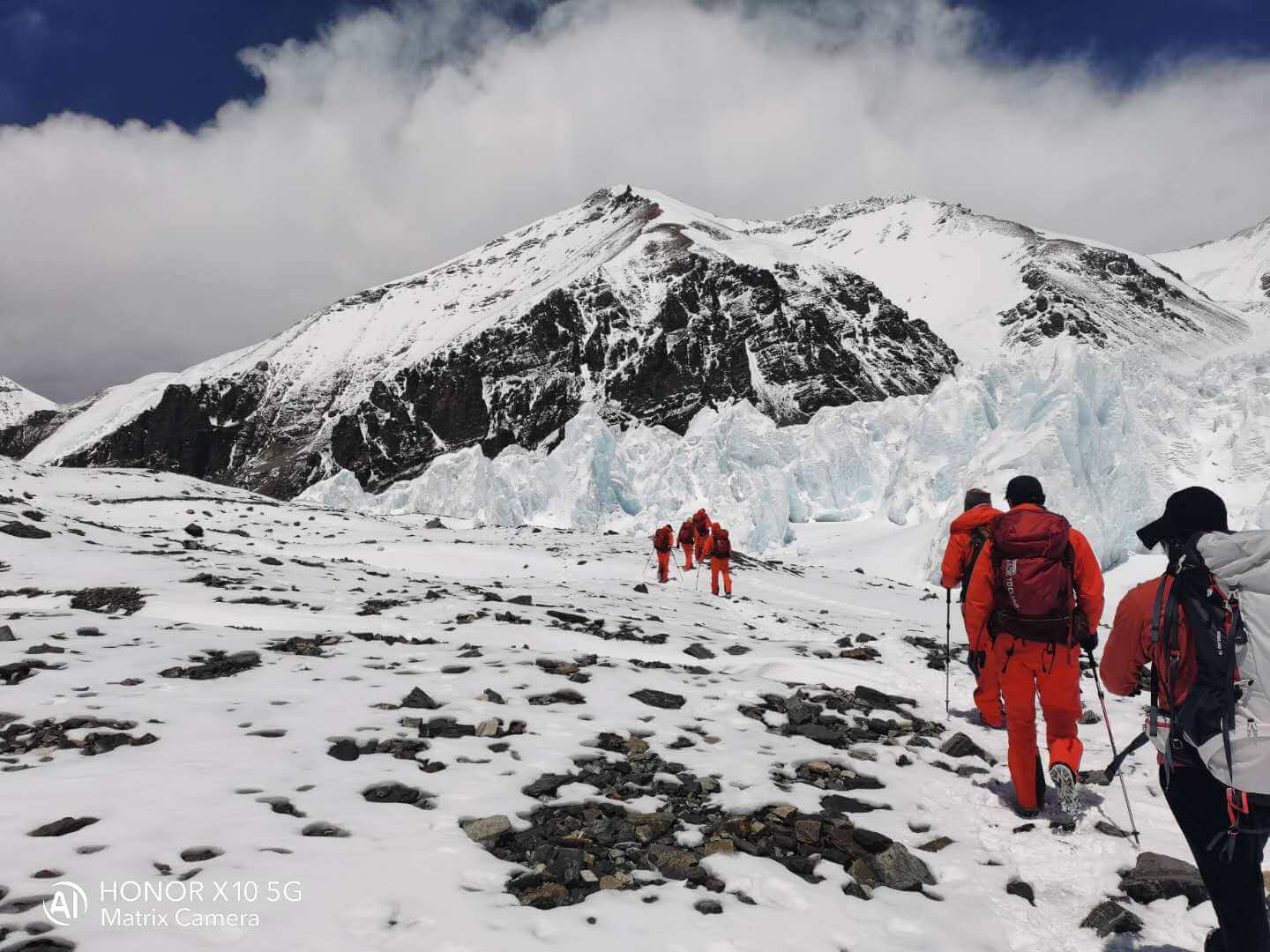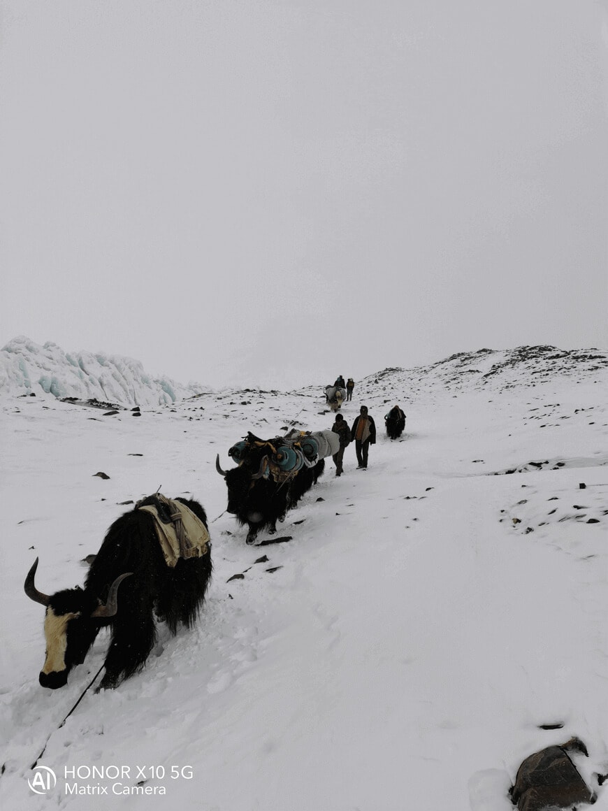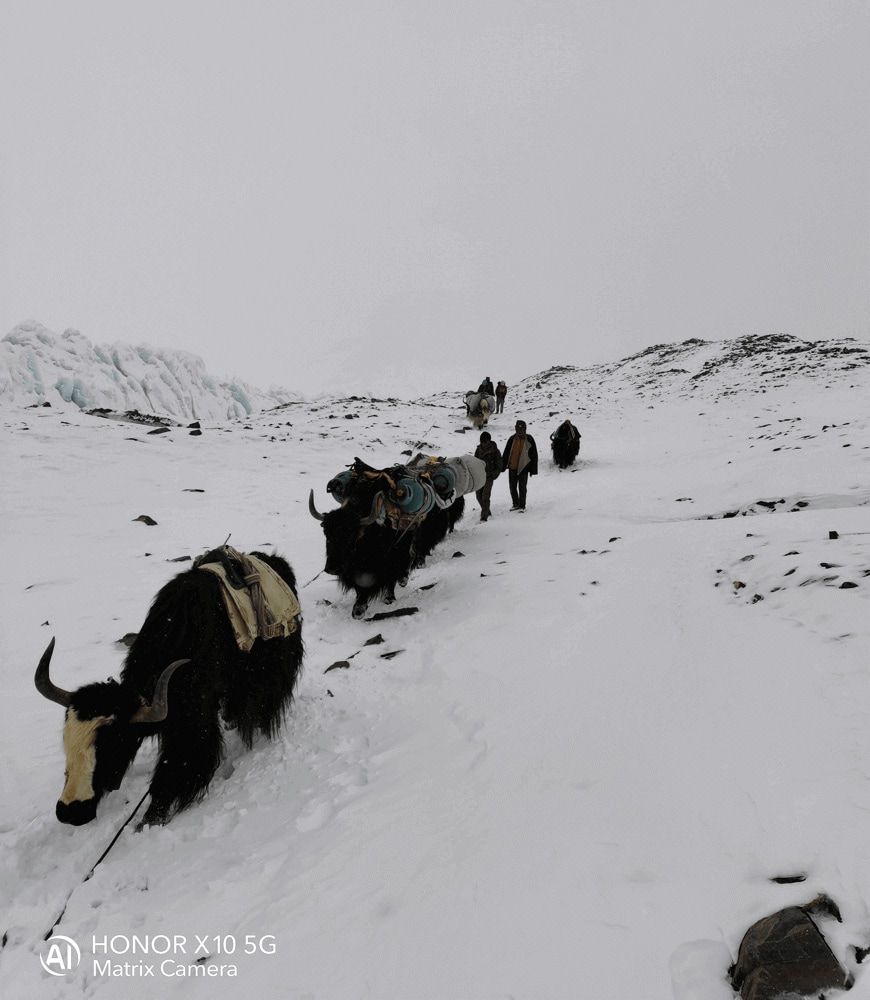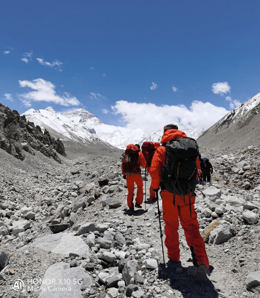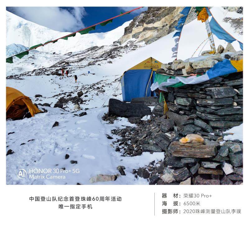 2020珠峰测量登山队全体成员成功抵达海拔6500米的前进营地。登山队员李璞和蔡卿用手中的荣耀手机记录下了攀登途中美景:壮丽的冰川,无言“伙伴”牦牛等,并利用5G实时回传。
