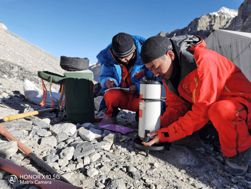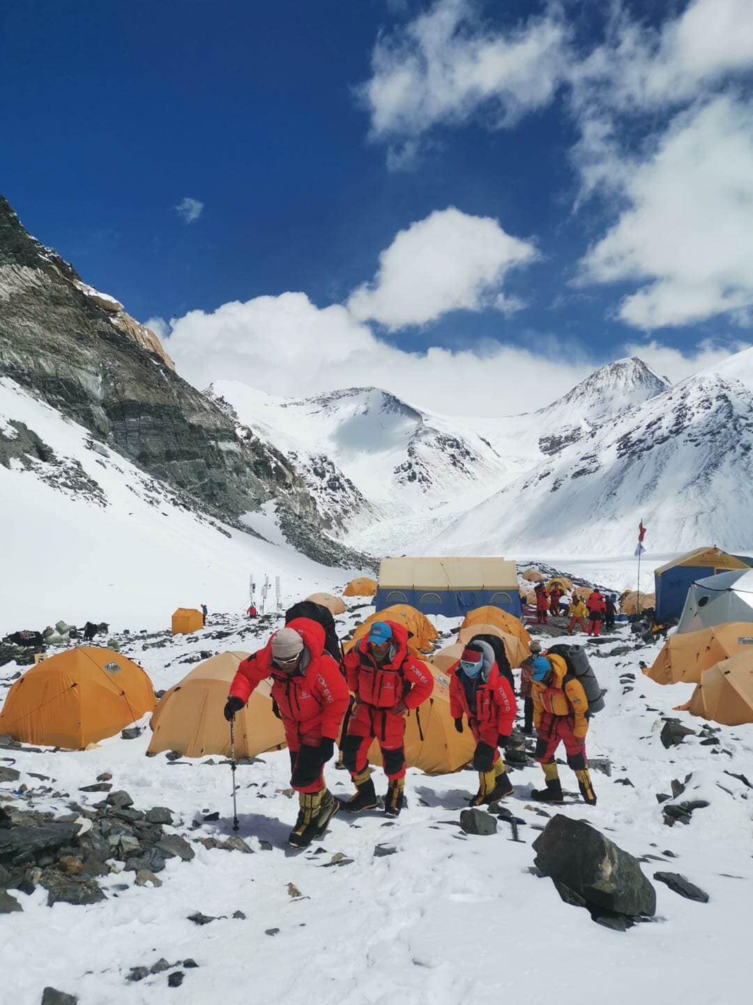2020珠峰登山测量登山队全体队员在海拔6500米前进营地继续休整,巩固测量仪器使用方法,并进行攀登技能训练。