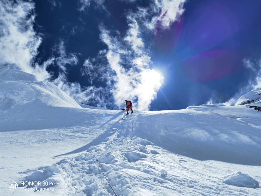 在6500米前进营地通往峰顶的路途中,需要经过一段坡度在40-50度、高差近400米的巨大冰壁——北坳冰壁。这里冰雪厚度达100多米,极易发生冰崩和雪崩,也是北坡登顶路线中的第一大险关。中国登山队队员蔡卿用荣耀手机记录下了队员们在攀登北坳冰壁时的珍贵影像。