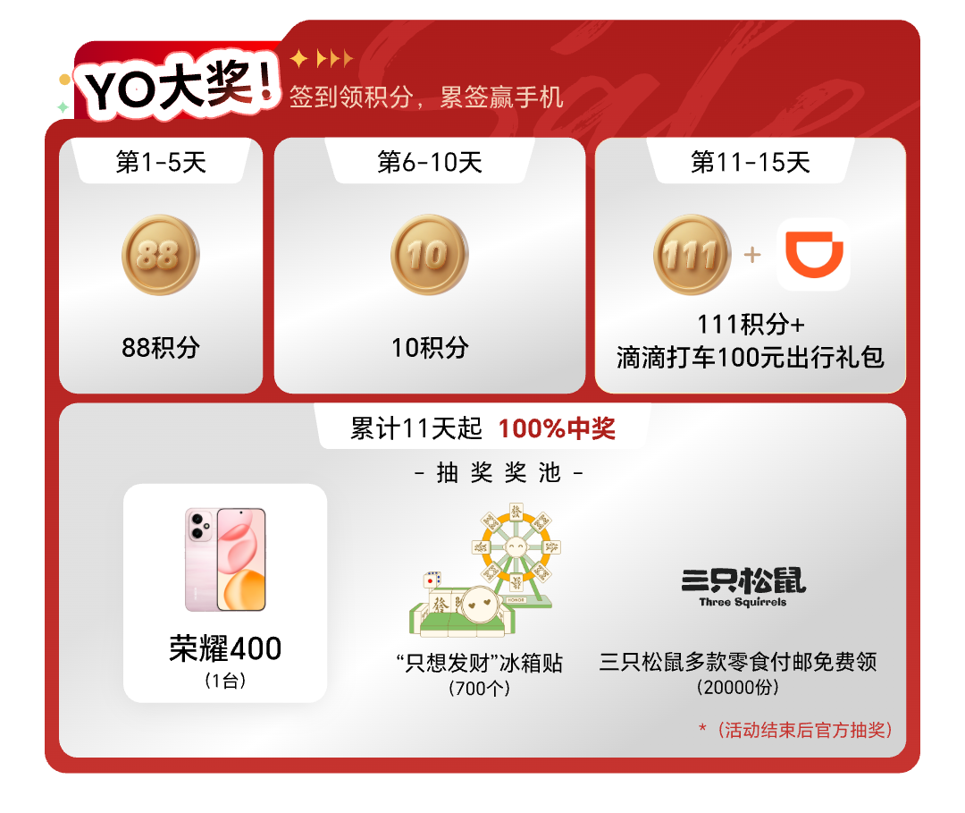 累计签到11-15天抽奖奖池(活动结束后官方抽奖):荣耀400*1、“只想发财”冰箱贴*700个、三只松鼠多款零食付邮免费领*20000份