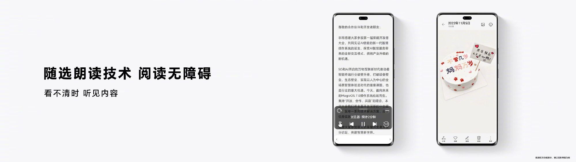 在近期发布的AI使能的个人化全场景操作系统MagicOS 7.0中,荣耀也带来了多项全新无障碍功能。比如,“随选朗读”可基于Magic文本的识图语义理解能力,帮助视障人群随心听取屏幕上文字或者是图片的内容,让看不清的人听得见;“远程守护”帮助子女保护父母人身和财产安全,防止老人发生意外或遭遇诈骗。
