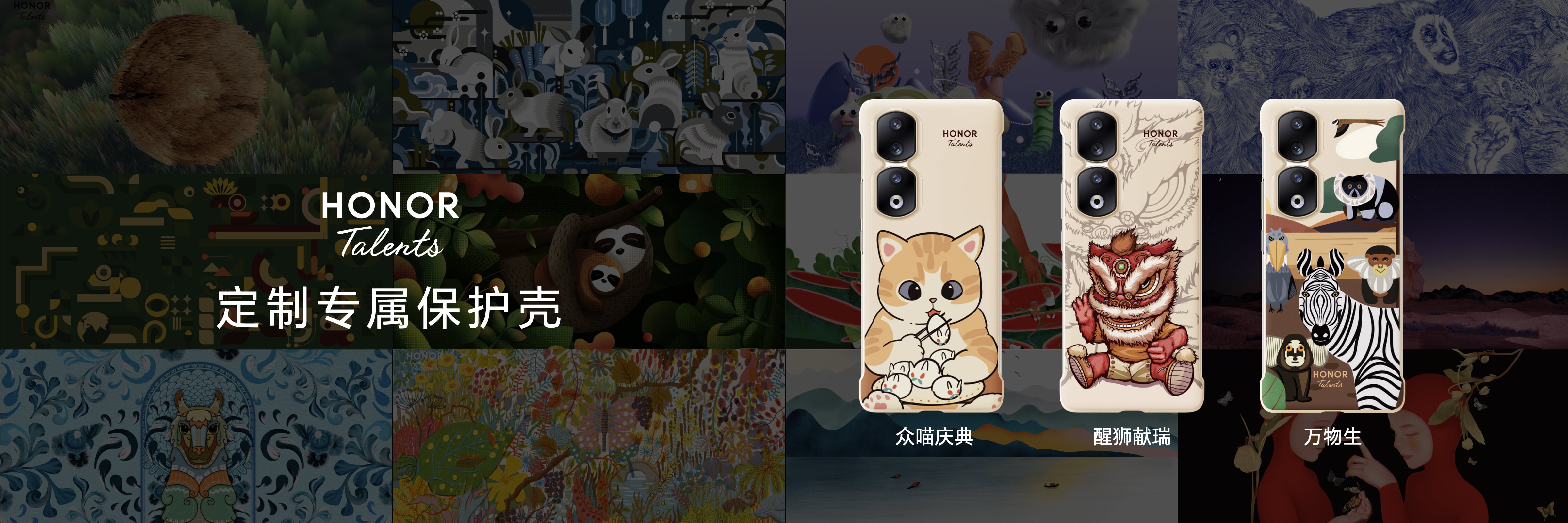 在荣耀90系列荣耀发布会上,我们精选了三件优秀获奖作品,为消费者带来了HONOR Talents定制专属保护壳,分别是活泼可爱的《众喵庆典》,取自传统文化的《醒狮献瑞》,表达环保理念的《万物生》。