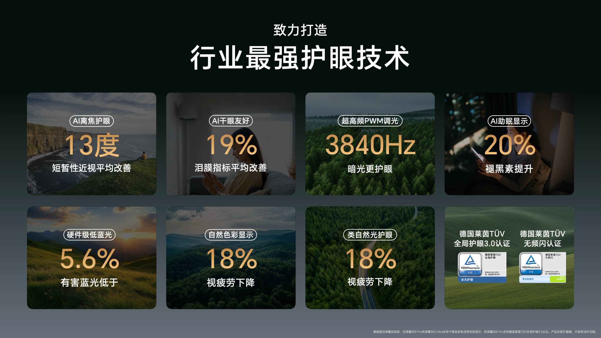 荣耀始终是健康显示的引领者,荣耀300系列再度实现了屏幕护眼体验的巨大跨越。特别是荣耀300 Ultra,搭载了历代最强的荣耀AI自然光绿洲护眼屏,集成了诸如圆偏振光护眼、晕动舒缓显示、AI离焦护眼及AI干眼友好护眼等多项创新特性,为用户的视力健康提供了全方位的保护,树立了行业屏幕护眼的新标准。