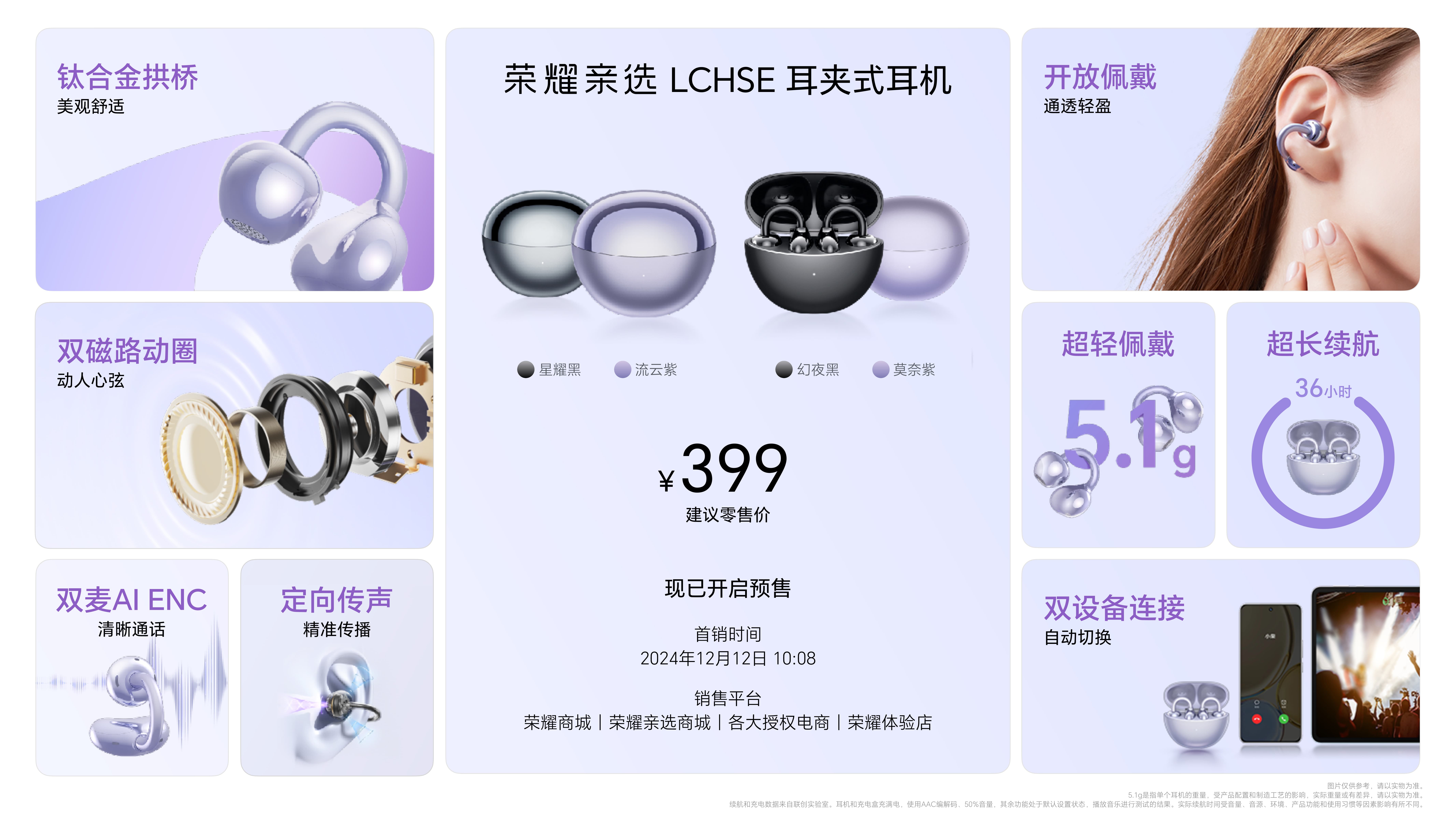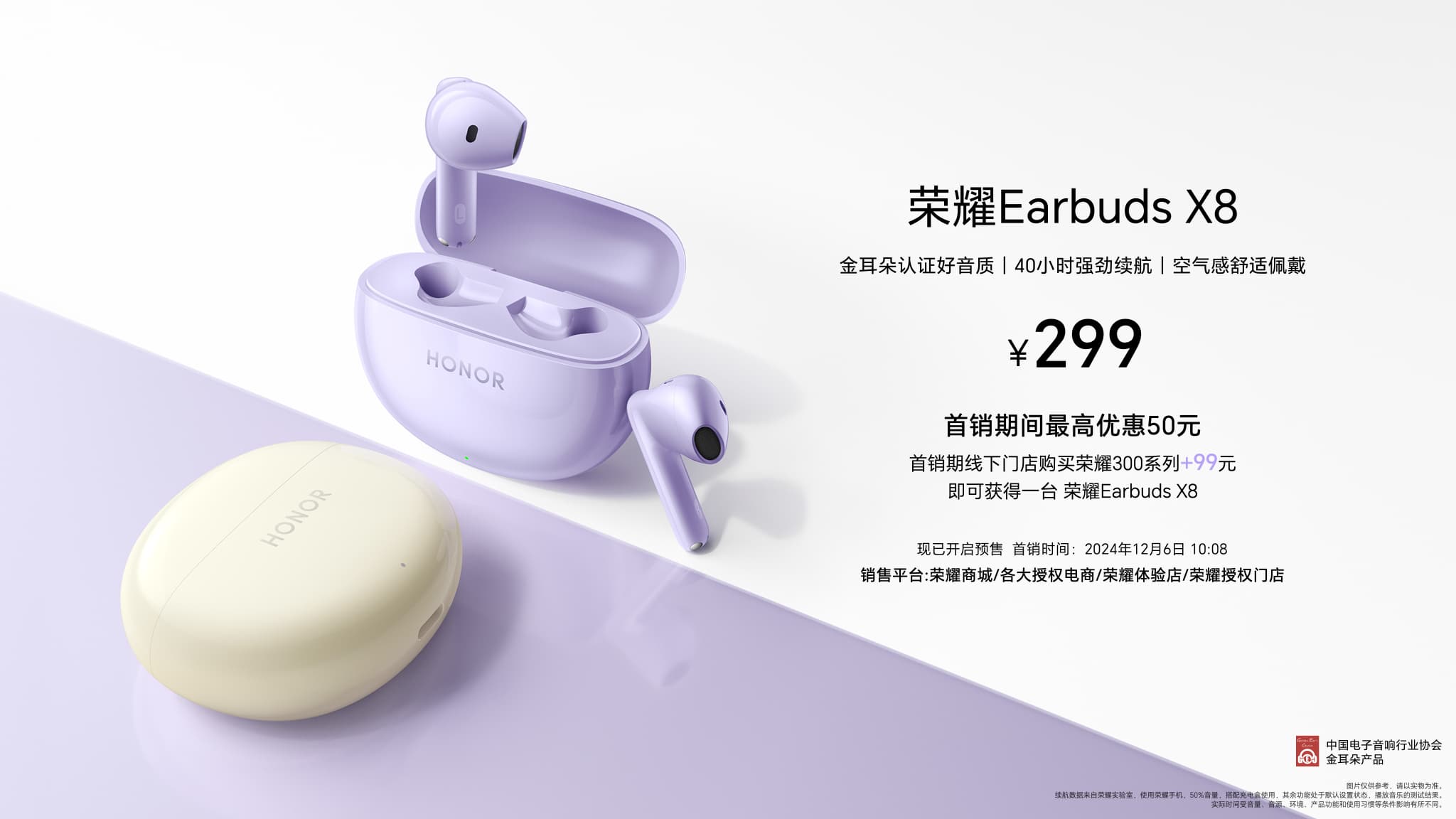 新款耳机荣耀Earbuds X8也在本次发布会上首次和大家见面,拥有金耳朵认证好音质,40小时强劲续航,空气感舒适佩戴。 另有荣耀亲选LCHSE耳夹式耳机全新发布,钛合金拱桥设计,开放佩戴通透轻盈,以及荣耀亲选耳机TiinLab S7、荣耀亲选小湃室外摄像头i等新品现已开售。