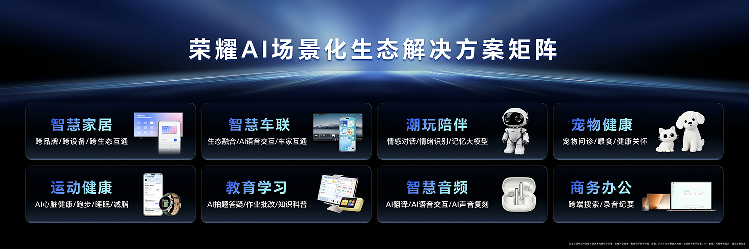 为解决用户面对“场景割裂、服务单一”的智能生态时带来的碎片化体验,并攻克行业长期存在的互联互通难题,荣耀基于HONOR AI Connect平台,发布了8大AI场景化生态解决方案,覆盖智慧家居、智慧车联、潮玩陪伴、宠物健康、运动健康、教育学习、智慧音频、商务办公等场景。此次发布的8大AI场景化生态解决方案深度融合软硬件能力,是荣耀构建AI生态的核心引擎。