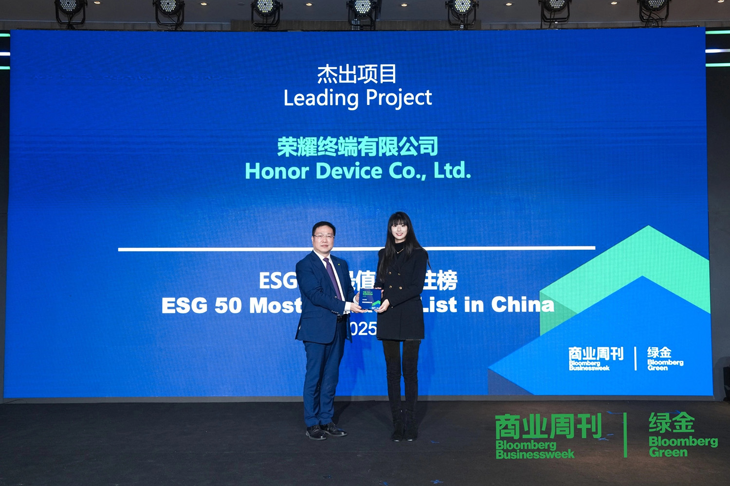 【2024年11月29日,上海】 11月29日,由彭博绿金(Bloomberg Green)和《商业周刊/中文版》(Bloomberg Businessweek)主办的彭博绿金ESG影响力论坛暨2024年度彭博绿金ESG50杰出榜单发布会在上海隆重举行。荣耀终端有限公司凭借在绿色环保领域的创新实践与卓越表现荣登榜单,并被授予“中国ESG 50最值得关注榜2025杰出项目”荣誉奖项。