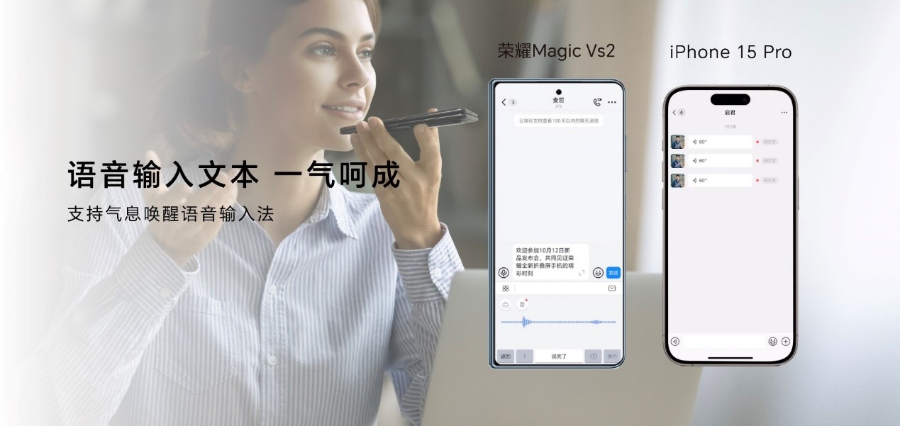 YOYO建议的智慧出行新增“机场大屏卡片”,用户可在手中随时看到航班进港/出港动态信息轮播,行程尽在掌握。气息唤醒功能也得到了全新升级。在需要输入文字的场景下,荣耀Magic Vs2可实现气息唤醒语音输入法,语音内容直接转为文字进行输入,沟通效率进一步提升。同时,荣耀Magic Vs2根据实际使用场景,带来更加智慧的扫码体验,翻腕即可完成扫码动作。