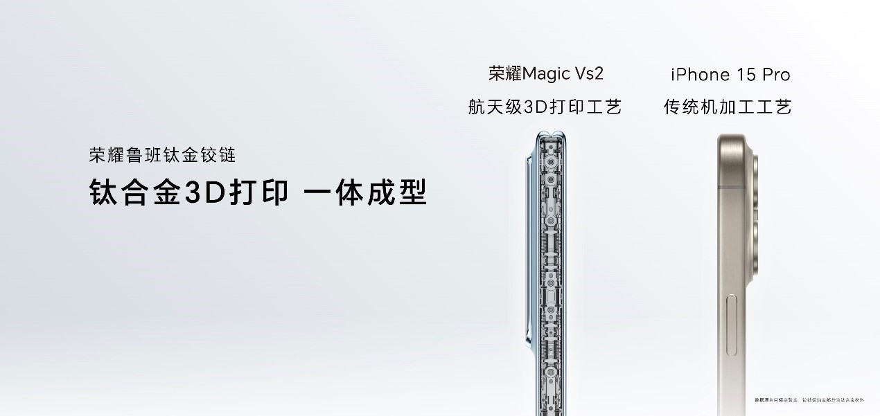 在折叠屏产品关键器件铰链方面,荣耀Magic Vs2采用由钛合金3D打印技术制成的荣耀鲁班钛金铰链,带来轻薄与坚固兼具的使用体验。铰链0齿轮结构和悬浮水滴结构的应用也让荣耀Magic Vs2开合顺滑,且支持多角度自由悬停。在轻量化更进一步的同时,荣耀Magic Vs2也做到了5.1mm的展开态厚度、10.7mm的折叠态厚度,在同类折叠屏手机当中继续保持领先水平。