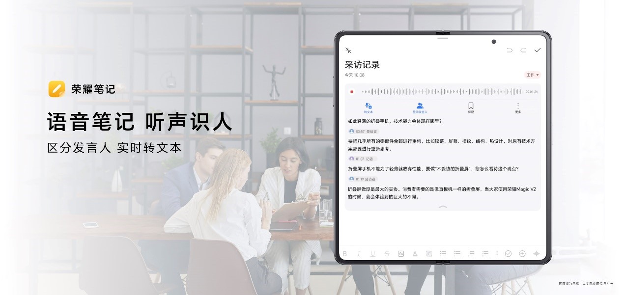 全新升级的Magic文本功能,将更智慧的语义与服务结合,更多的关联服务也能一键直达。全新升级的荣耀笔记,在语音声纹识别的加持下,在语音实时转文本的过程中能智慧区分发言人,文本分人记录,而且还支持视频收藏,实现更为强大智慧的音视频笔记记录。