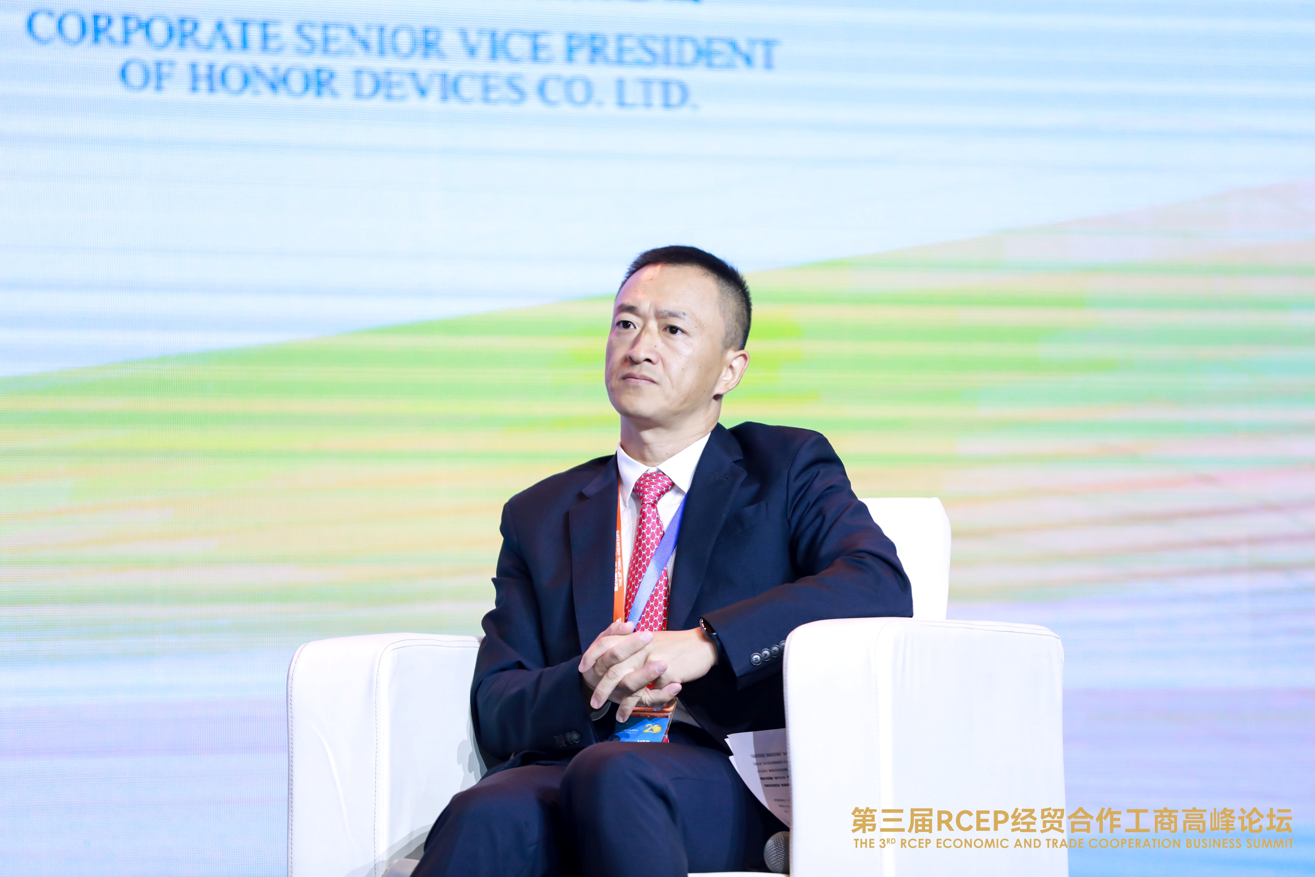 【中国南宁,2023年9月17日】9月17日,荣耀终端有限公司高级副总裁徐智煜受邀参加2023年中国-东盟博览会,出席第三届RCEP经贸合作工商高峰论坛并参与主题研讨。研讨中,徐智煜向与会嘉宾分享了RCEP将如何为企业发展带来新机遇。他强调,荣耀会继续加强产业链合作、开放创新以及关注人才培养与交流,积极拥抱全球化趋势,携手RCEP区域内伙伴,共同构建可持续产业生态。