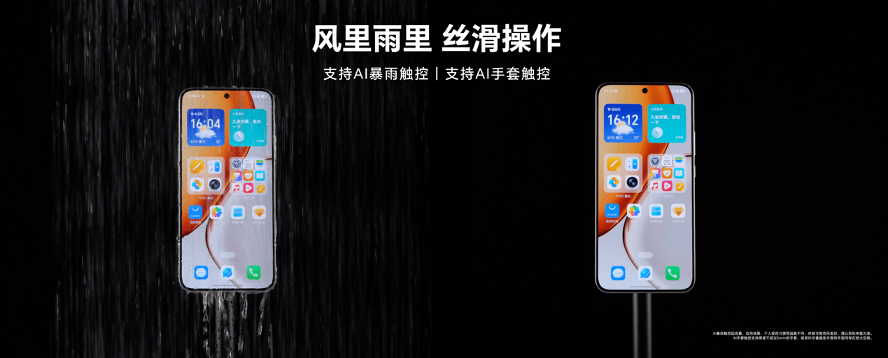 在被动防水的基础上,荣耀X70还带来主动防护升级,支持YOYO助手一键排尘排水、AI暴雨触控和AI手套模式,保障雨天、湿手或佩戴手套等场景下的精准操控,打造全天候全场景的极致耐用防水体验。
