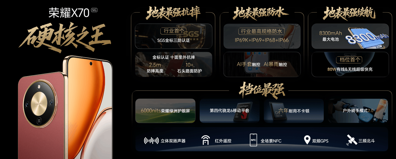 荣耀X70搭载荣耀自研三层防水架构让防护再升级,不仅具备IP69、IP68和IP66旗舰级顶配防水能力,还是主流厂商首款通过IP69K工业级防水认证的机型,构建起IP69K+IP69+IP68+IP66四重防护体系,率先实现行业航海级密封防护。整机具备应对高温高压冲洗、深水浸泡、暴雨泼溅等多种复杂场景能力,实现6米防护深度,85℃热水防护,18种液体抗侵蚀及30天浸水(1米)稳定运行,全面刷新主流手机防水标准。